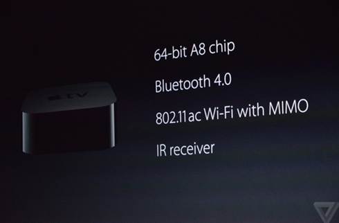 新Apple TV搭载64位A8芯片,支持蓝牙4.0、802.11ac Wi-Fi MIMO、红外接收器,后置电源接口、HDMI接口和以太网口。遥控器支持蓝牙4.0,配备音量控制键、内置加速器和陀螺仪,单次充电续航时间可以达到3个月。