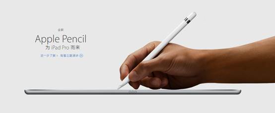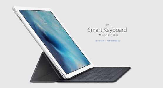 苹果针对iPad Pro还推出两款外设产品,分别是Apple Pencil及Apple Smart Keyboard。Apple Pencil内置高灵敏度的反馈传感器,可捕捉用户持笔下压、倾斜和轻击等多种动作,续航时间只有几个小时,不过可以插入iPad Pro来充电。