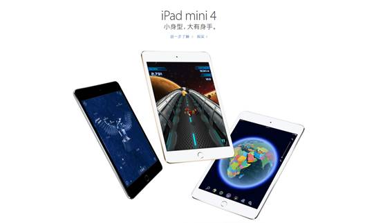 此外还发布了iPad mini 4,出屏幕尺寸保持“mini”,其硬件参数与iPad Air 2一致。