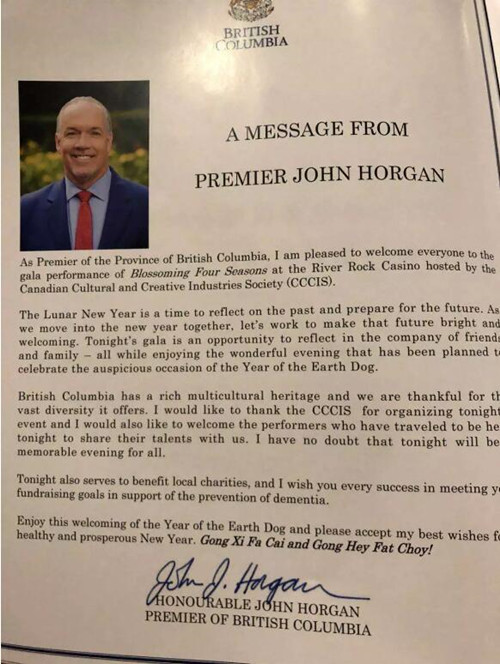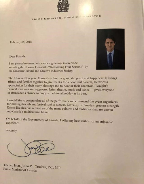 加拿大总理贾斯廷·特鲁多致贺信赞扬乌兰图雅“花开四季”温哥华演唱会,贾斯廷·特鲁多在贺信中说道:“我很高兴向所有参加“花开四季”演唱会、加拿大文化和创意产业协会的人致以最热烈的祝贺。中国的春节象征着感恩、平安和幸福。它让朋友相聚在一起,感谢他们的收获,感谢他们的祝福,并向他们的祖先表示敬意。今晚的文化盛会,有歌曲、舞蹈等,让每一个人都能享受这个完美的日子。我祝贺所有的人们,并赞扬这次活动的组织者,非常成功。多样性是加拿大最大的优势,这件事让我们想起了许多文化和传统,这些文化和传统都被融合进了加拿大多元文化结构中。我谨代表加拿大政府,向大家致以最美好的祝愿。”