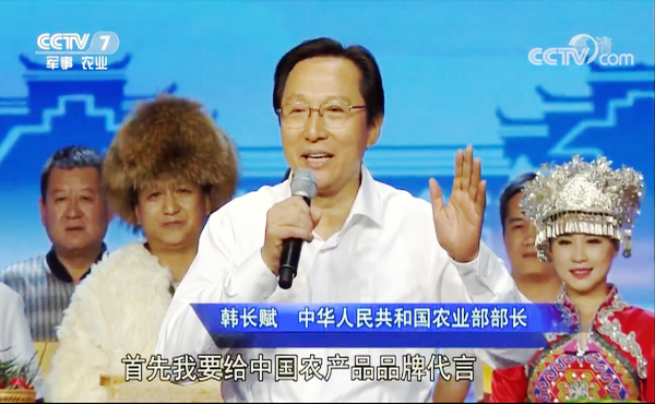 2017年9月20日晚,由CCTV-7倾情制作的“家乡的味道------我为品牌农产品代言”大型公益活动在北京举行,农业农村部部长韩长赋,以及全国二十余省的共二十余位省部级干部,都落座观众席。整场活动共26位推介人,分别推介了26款各具特色的品牌农产品。推介环节结束后,韩长赋部长登台,他说道:“首先,我要为中国农产品品牌代言。”