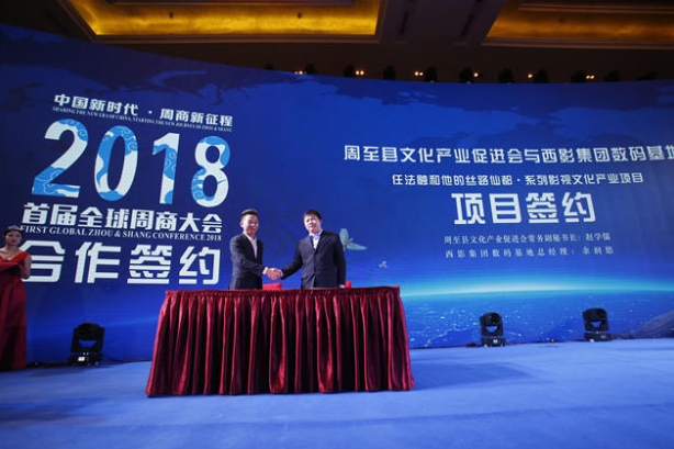 周至县文化产业促进会常务副秘书长赵学儒与西影集团数码基地总经理余润德就《任法融和他的丝路仙都》系列影视文化产业项目签约