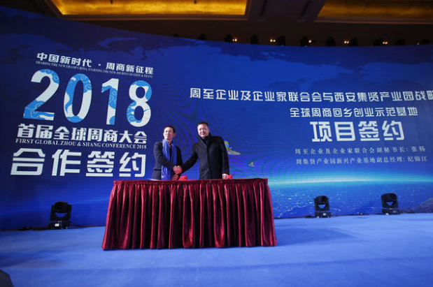 周至企业及企业家联合会执行秘书长张杨与周至县集贤产业园新兴示范基地总经理田昆就合作建设 全球周商回乡创业基地签约